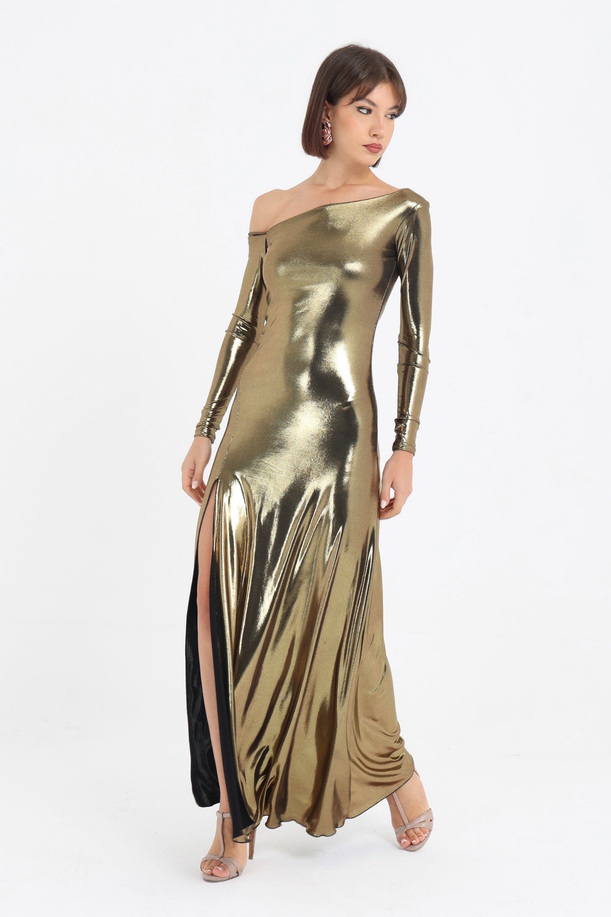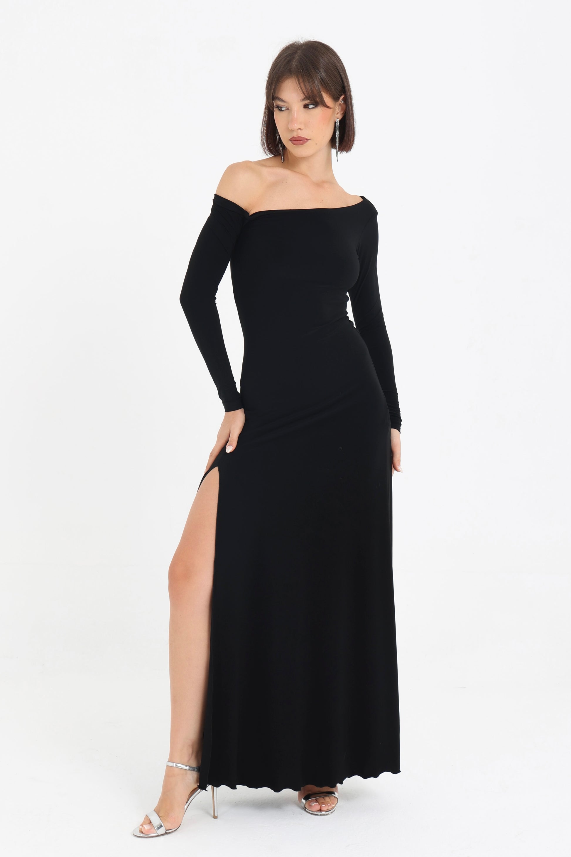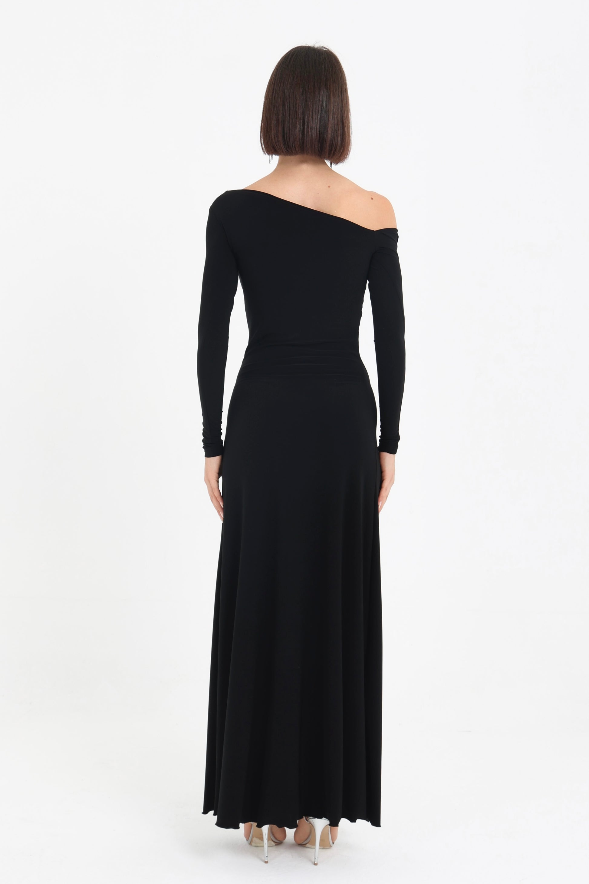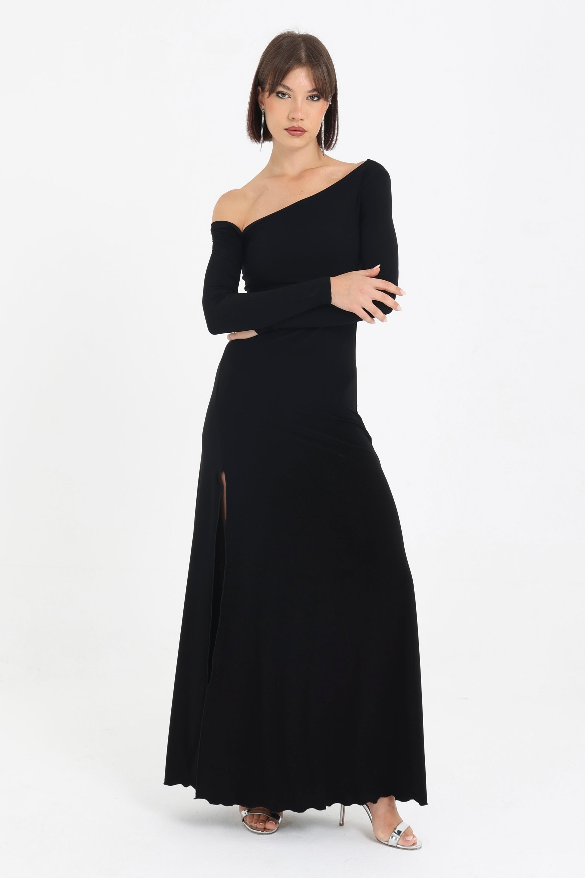 Abito in jersey con spacco laterale e scollo asimmetrico.