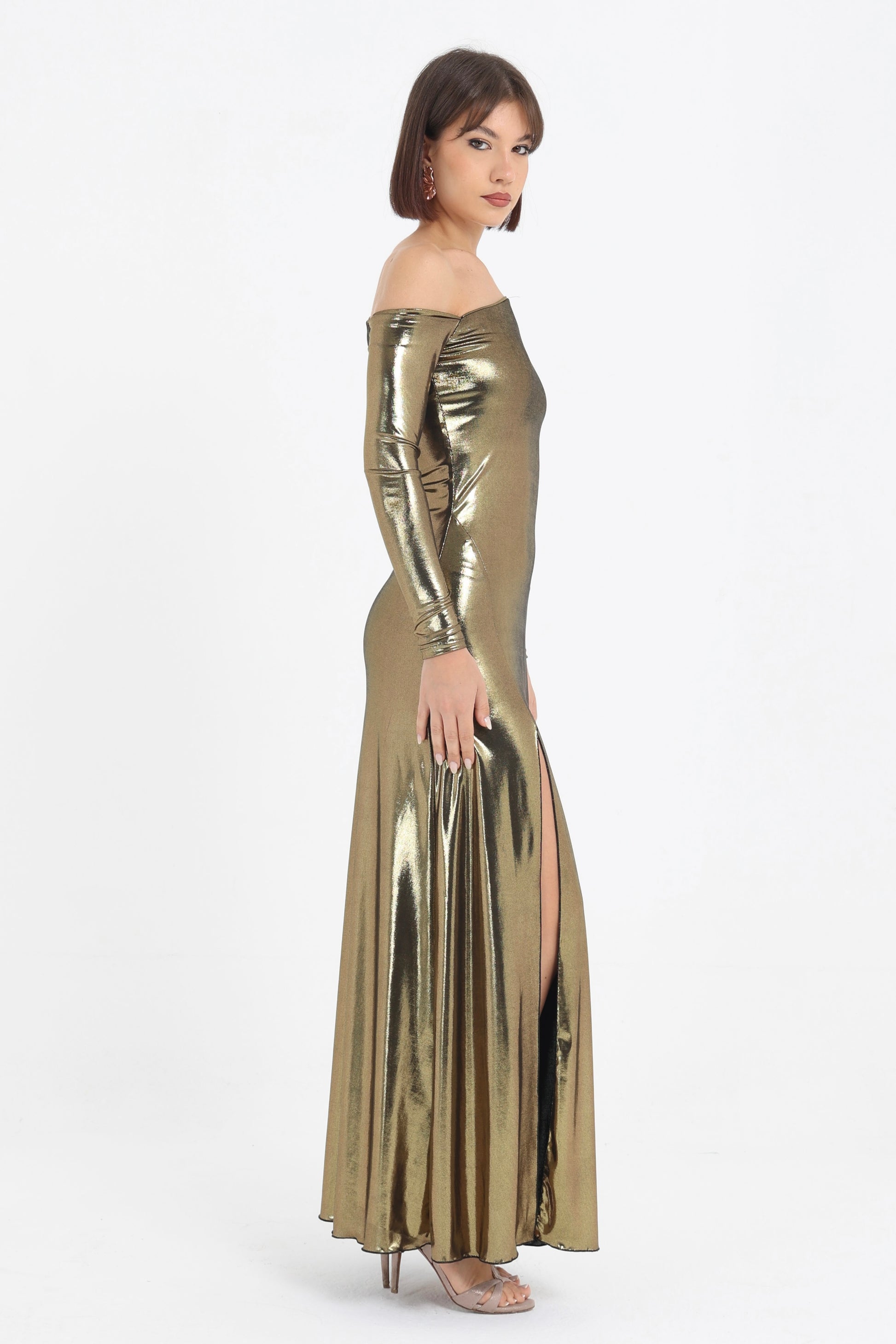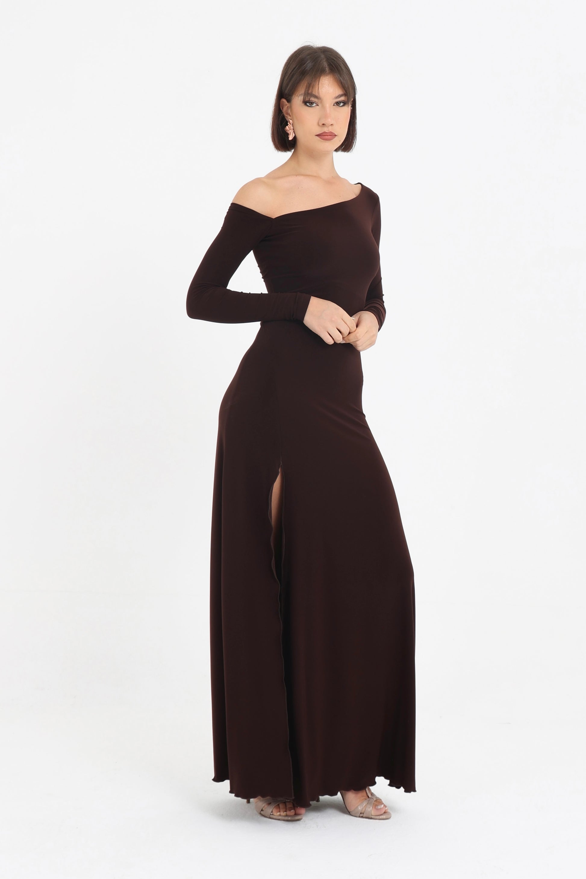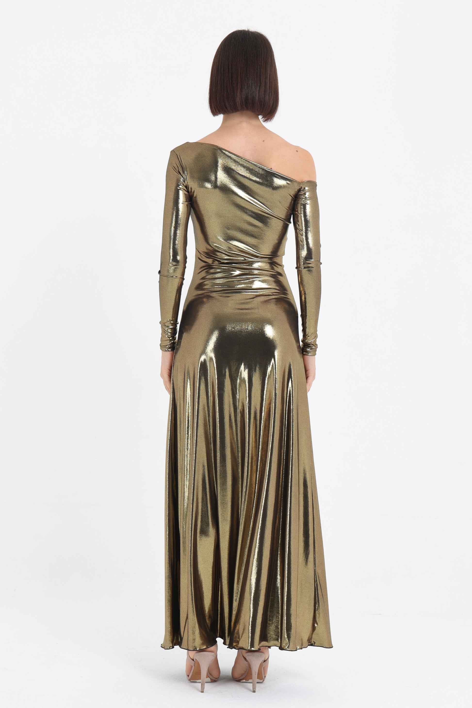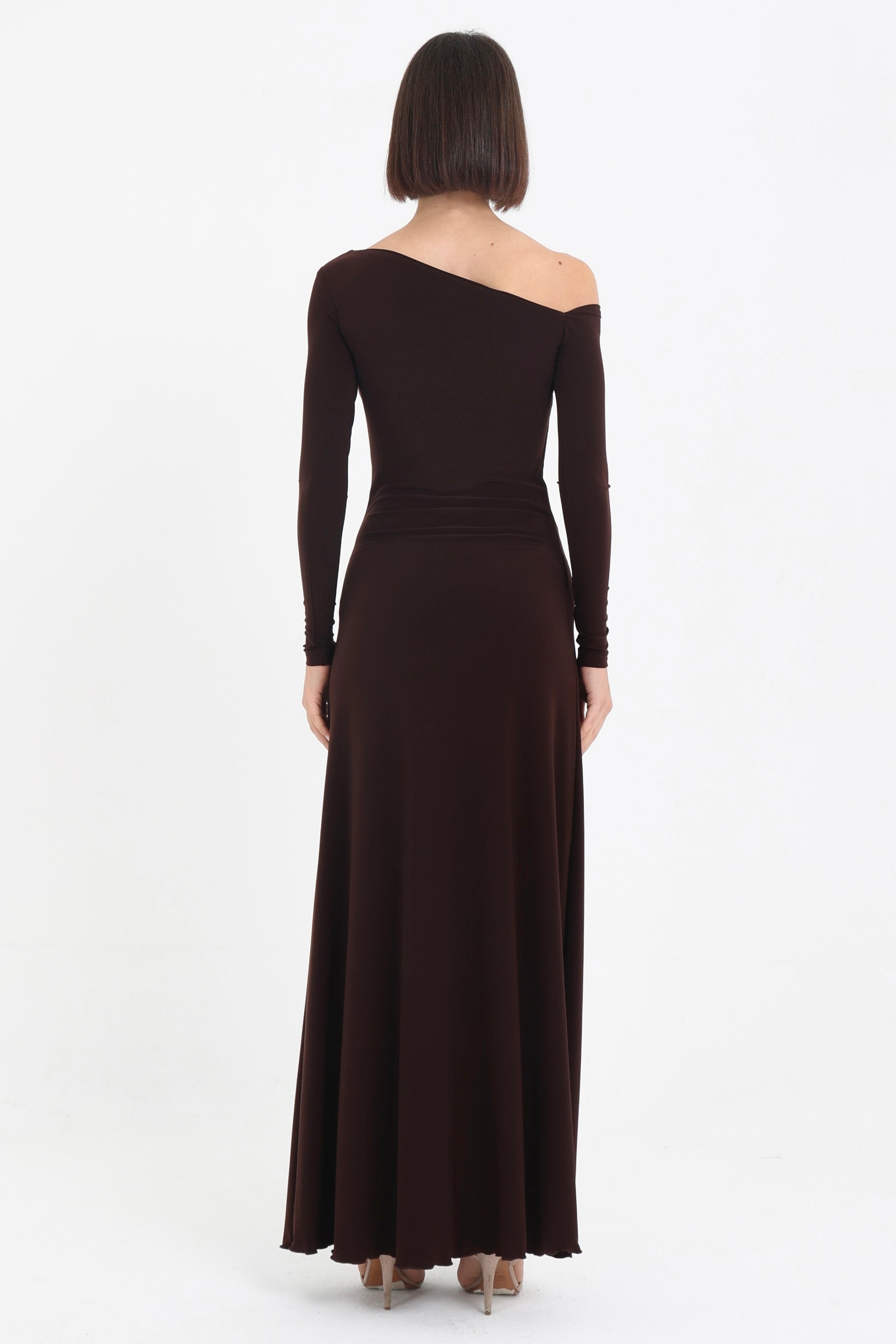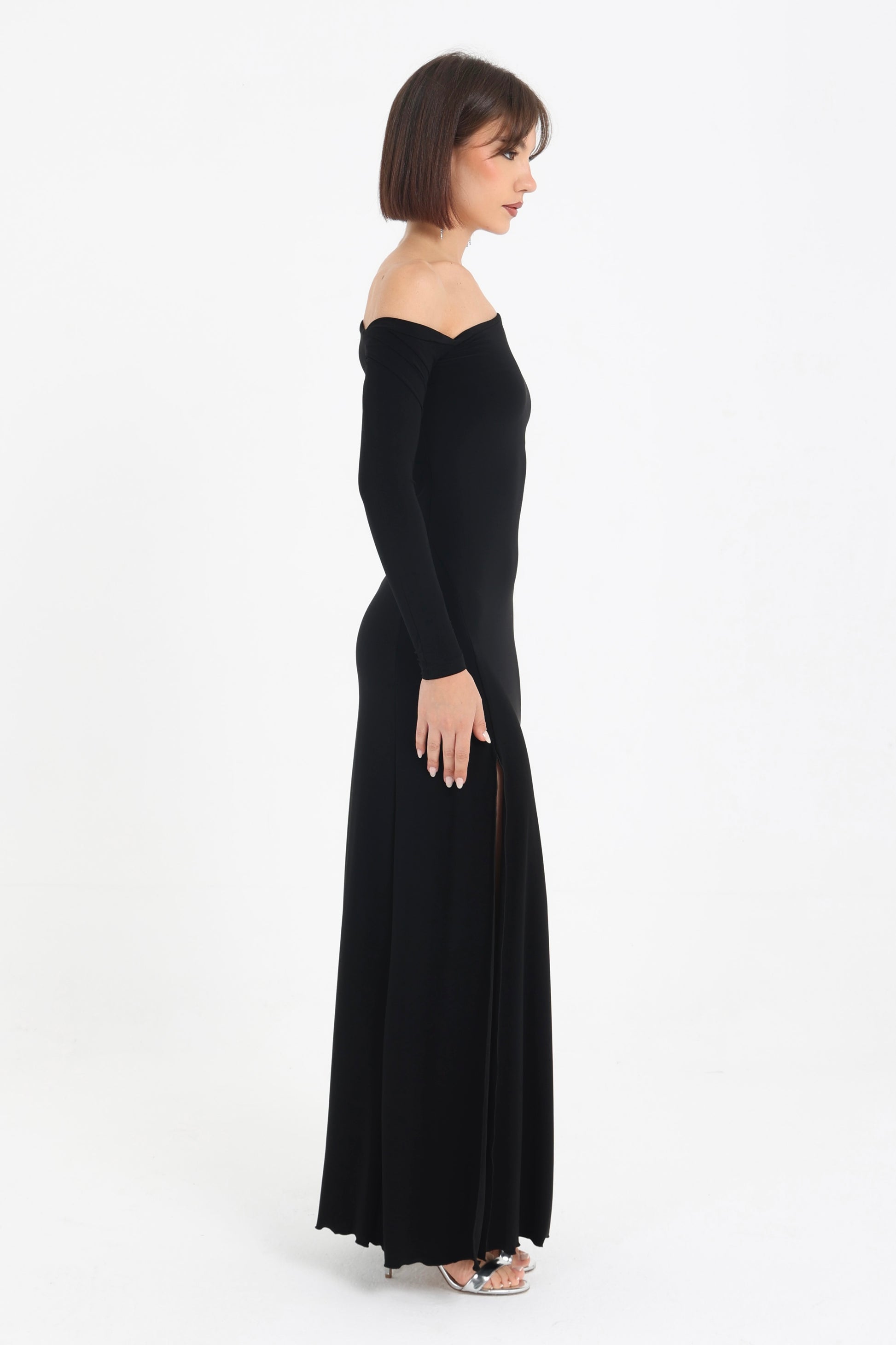 Abito in jersey con spacco laterale e scollo asimmetrico.