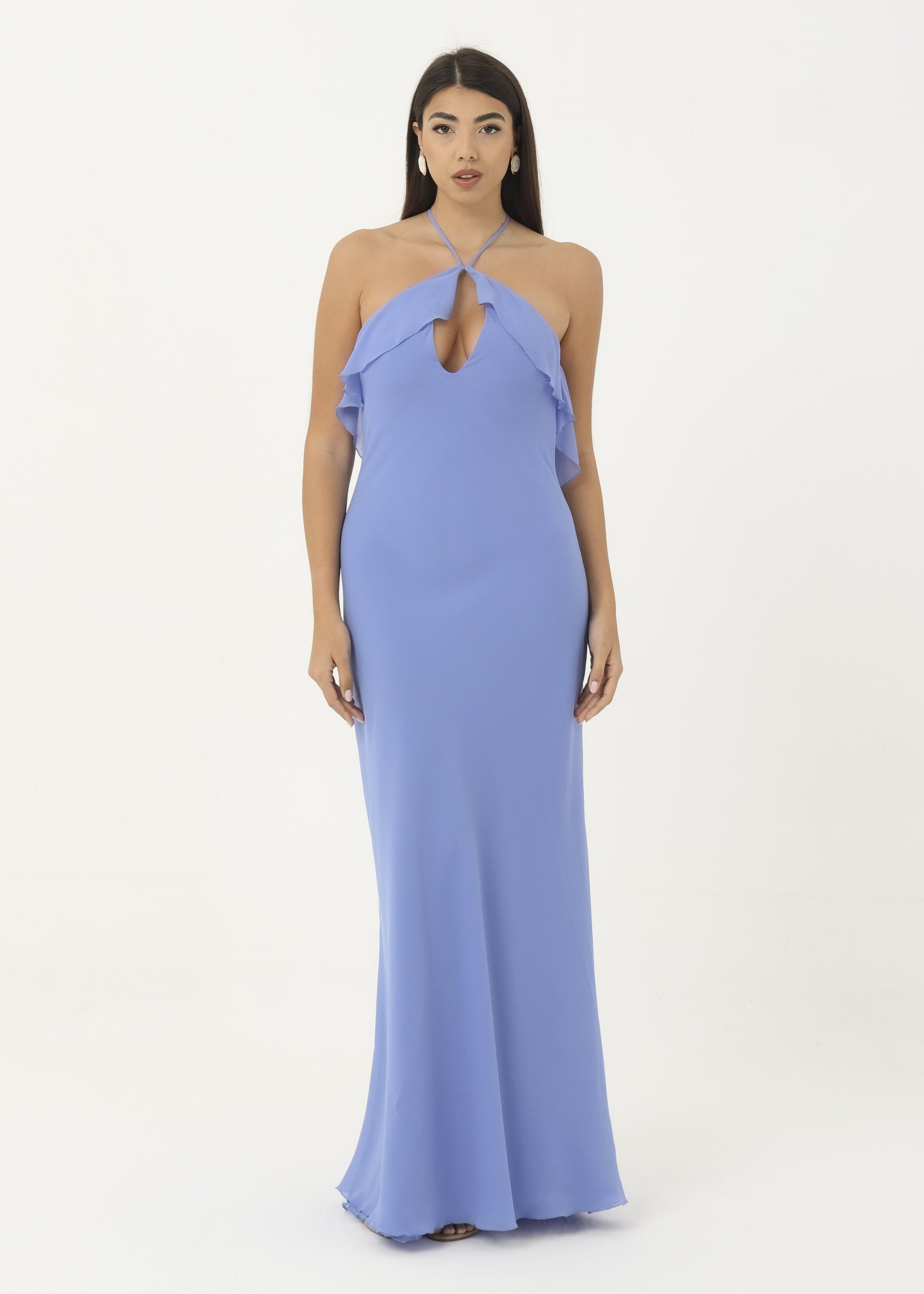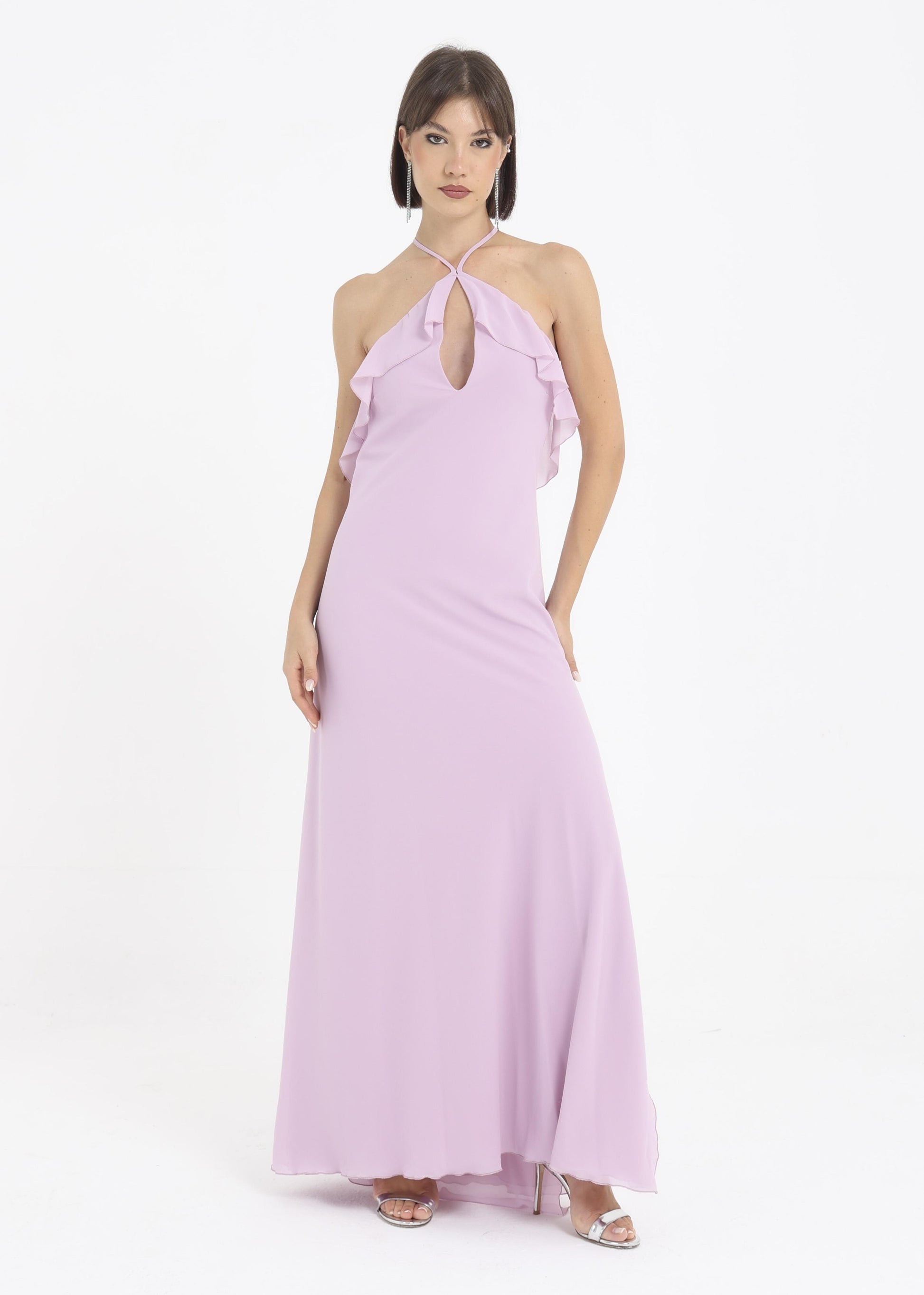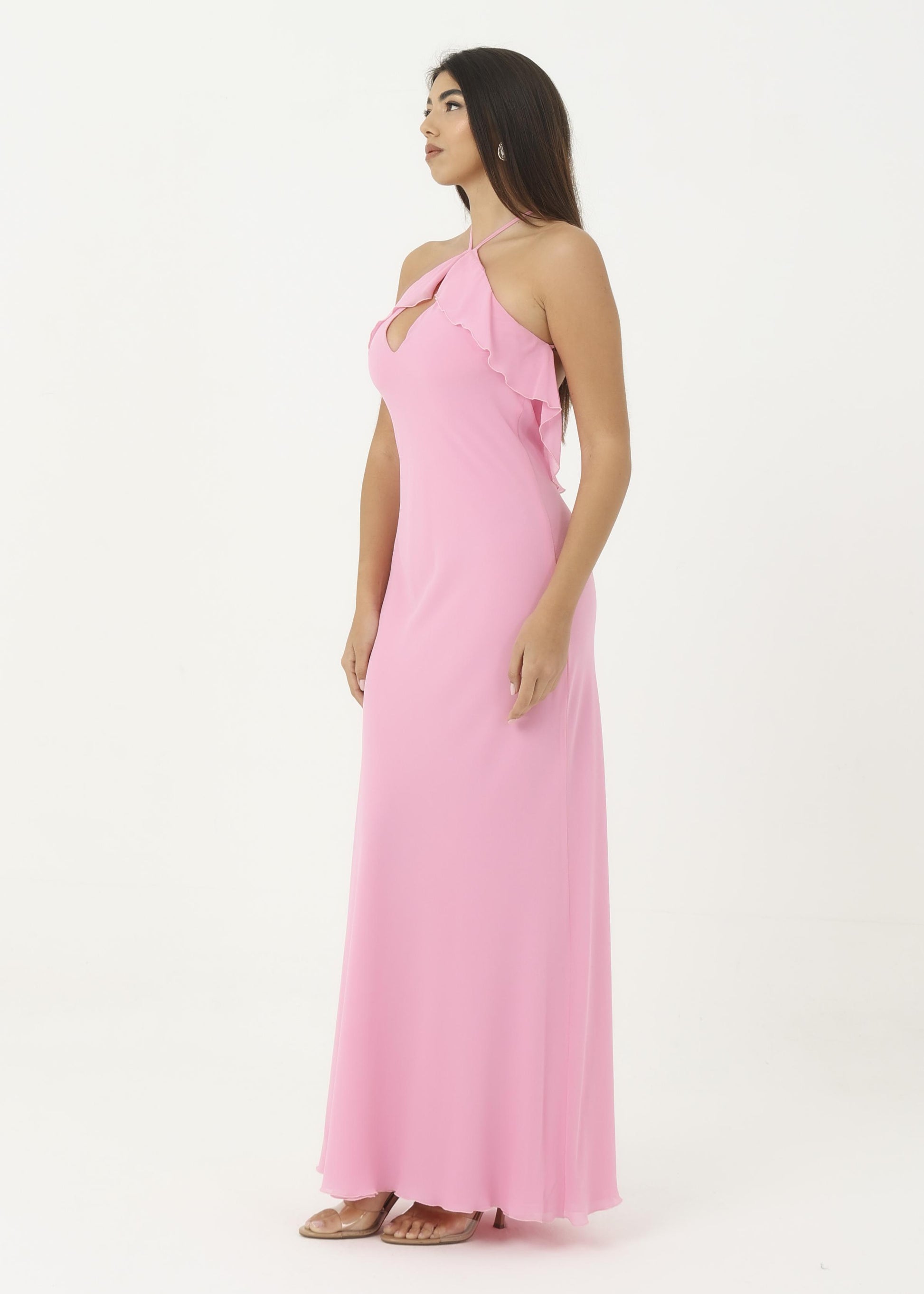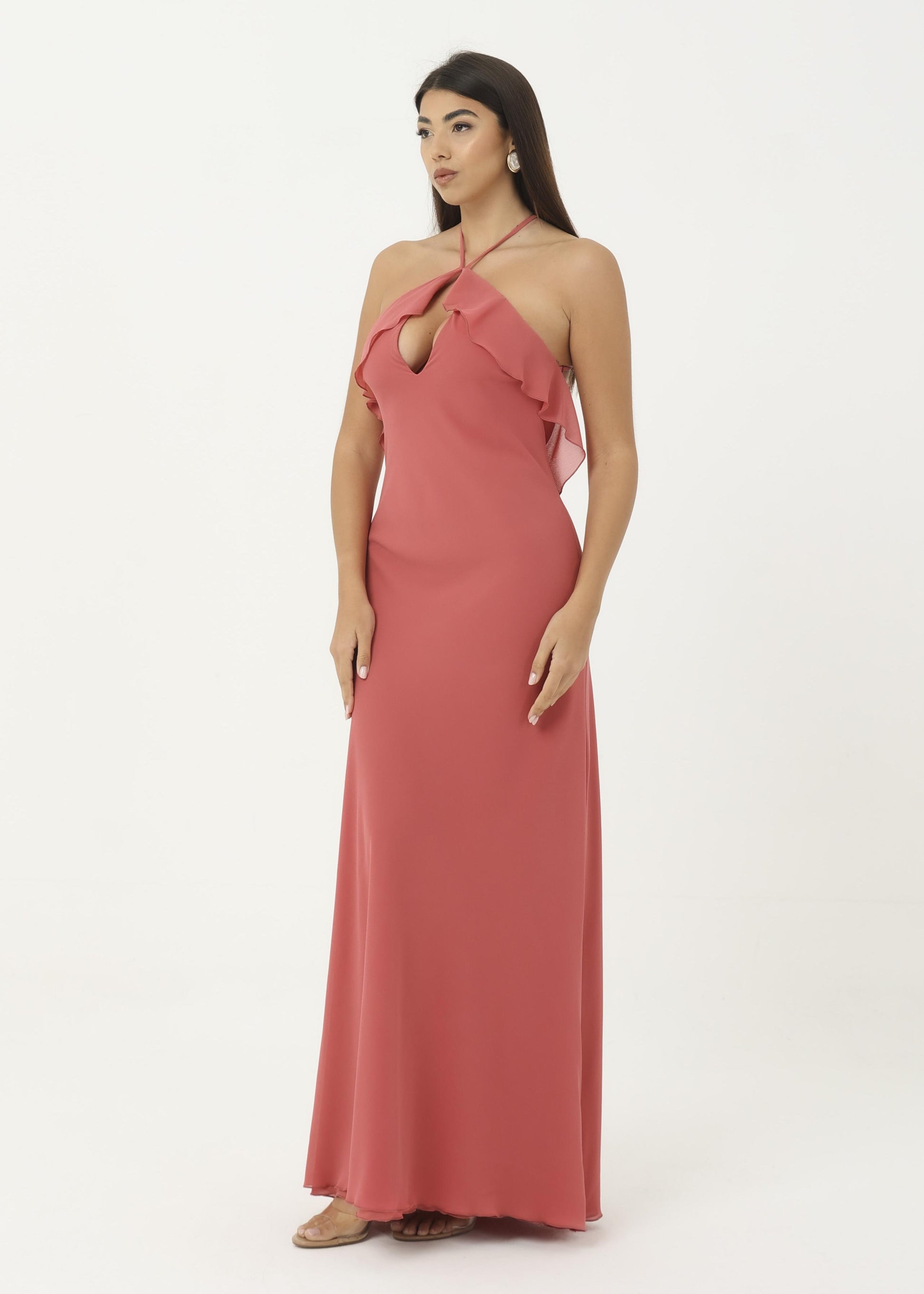 Abito in georgette morbido con rouches sul petto.