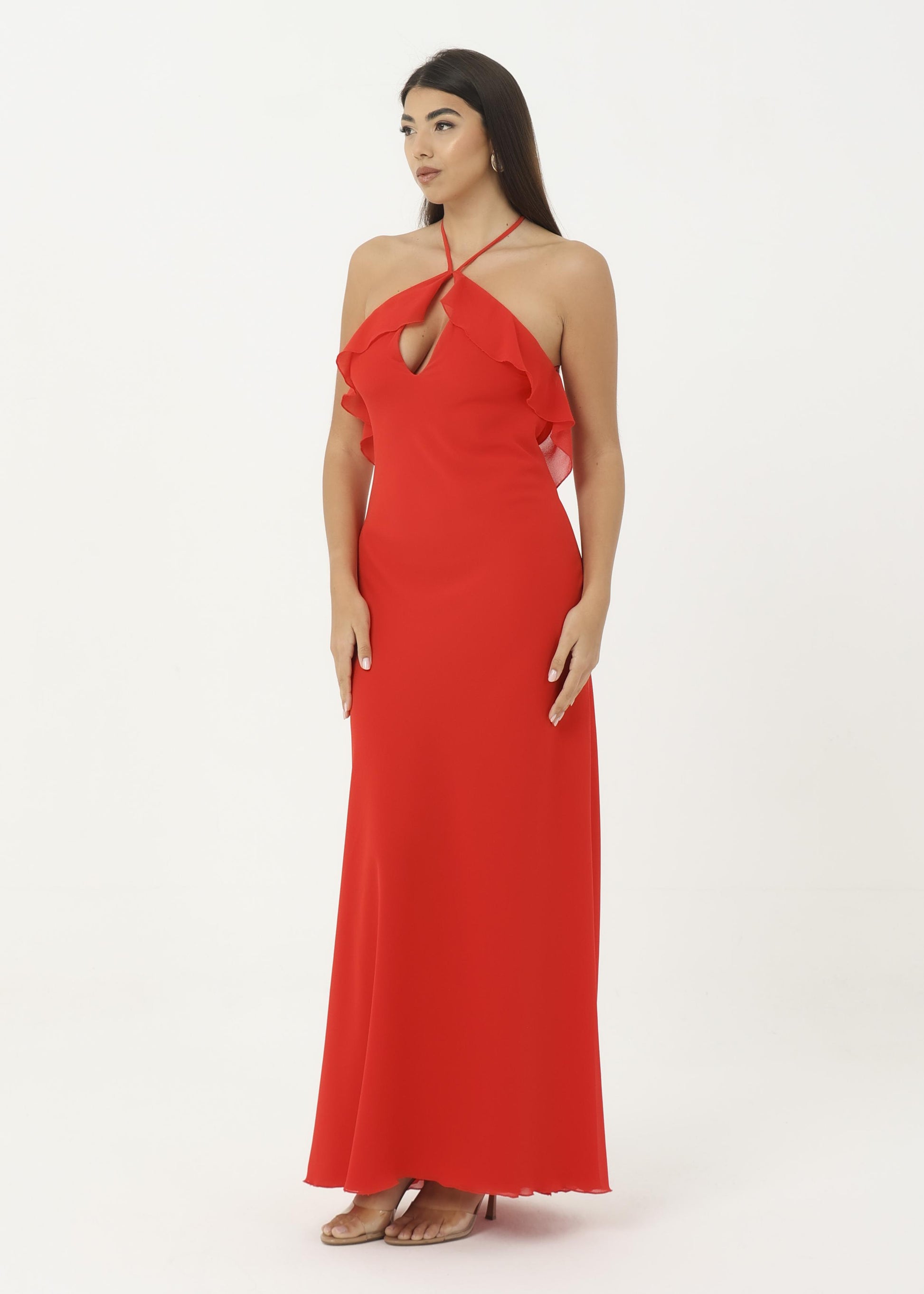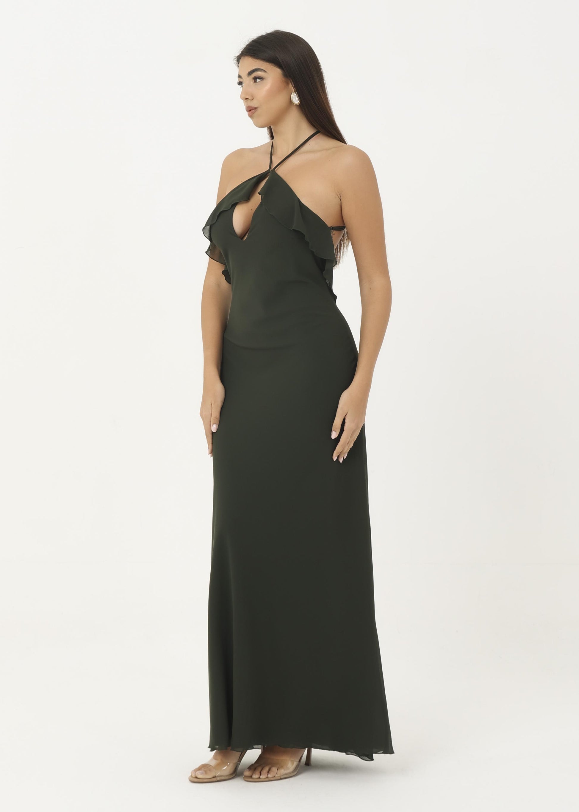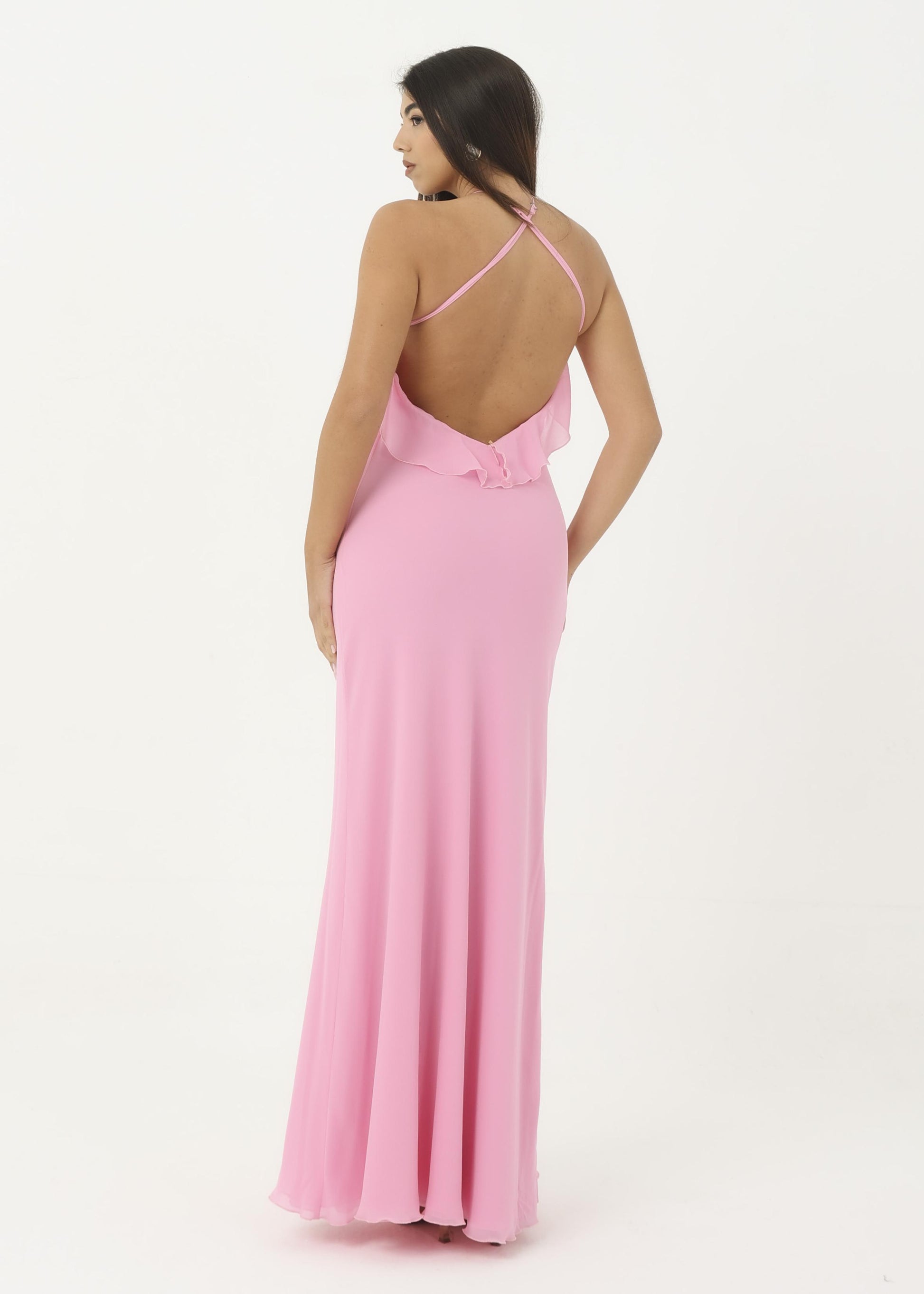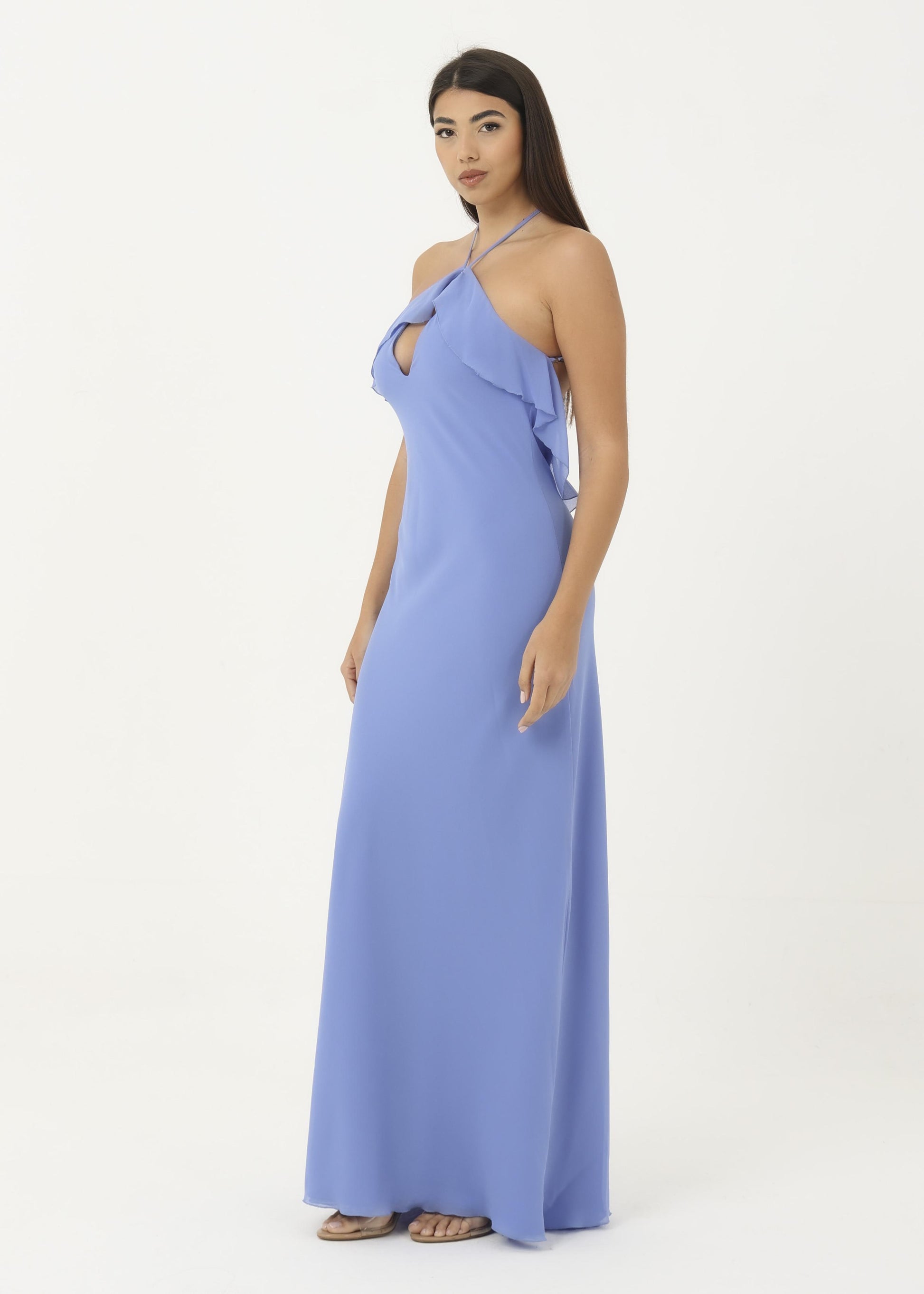 Abito in georgette morbido con rouches sul petto.