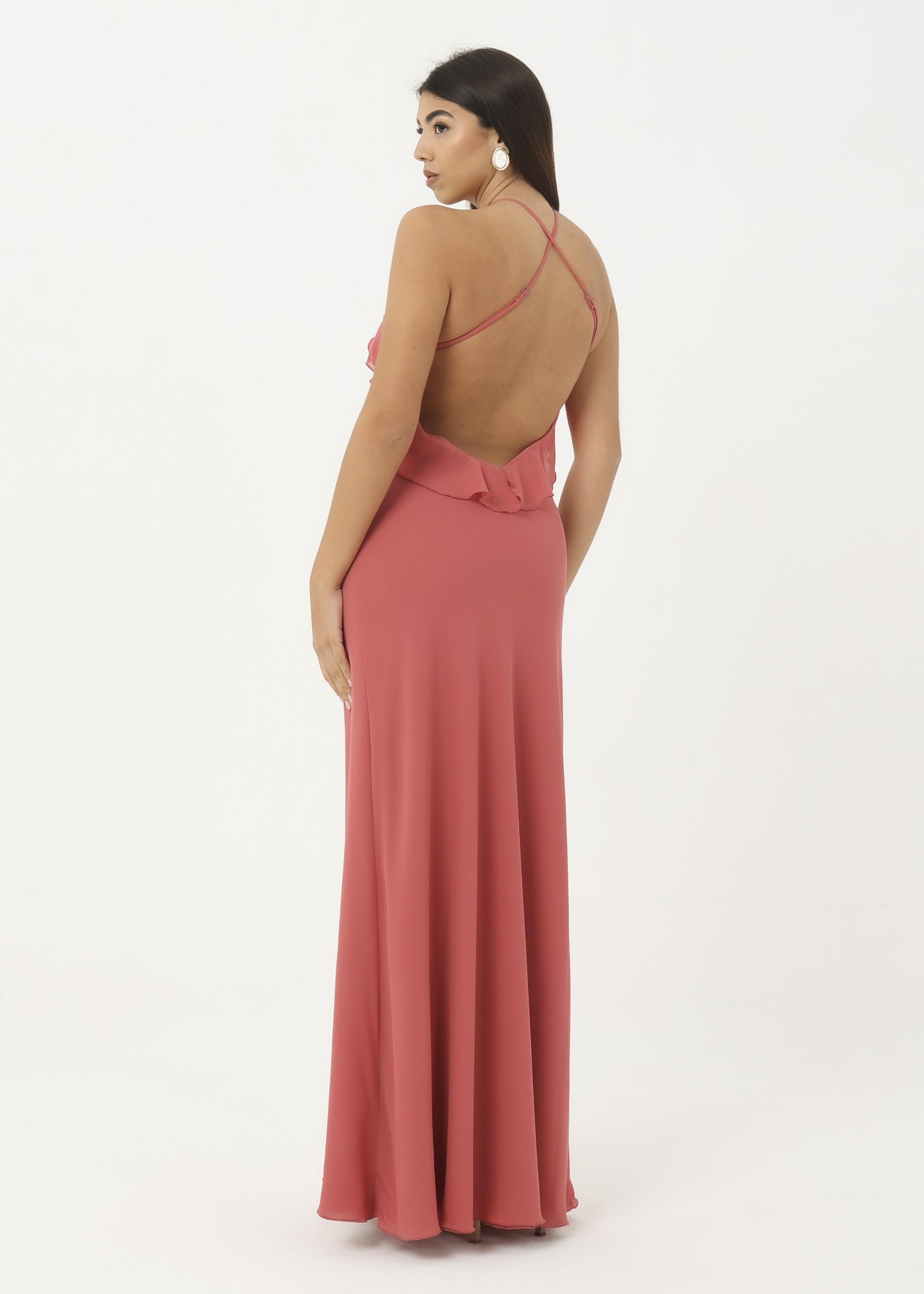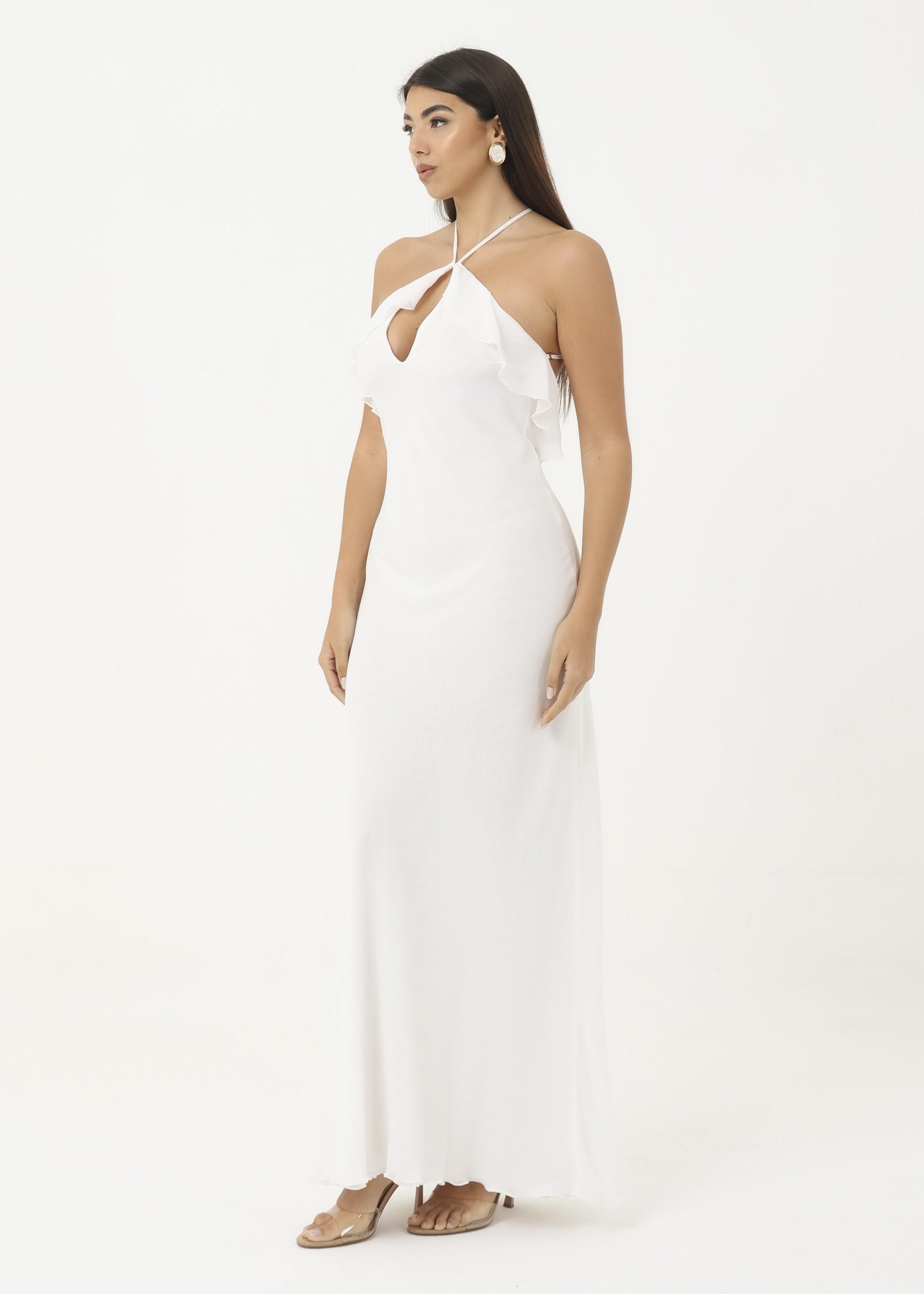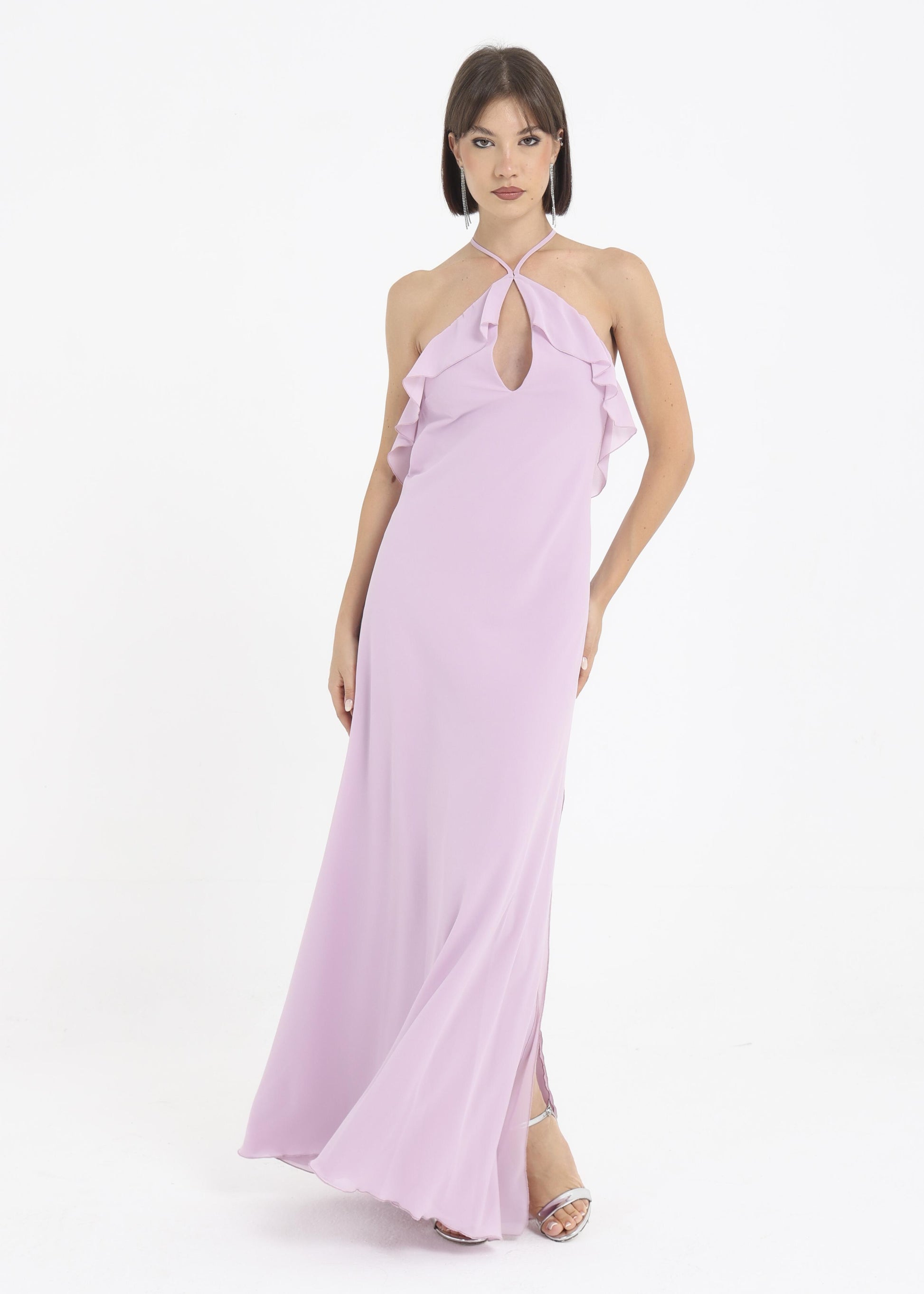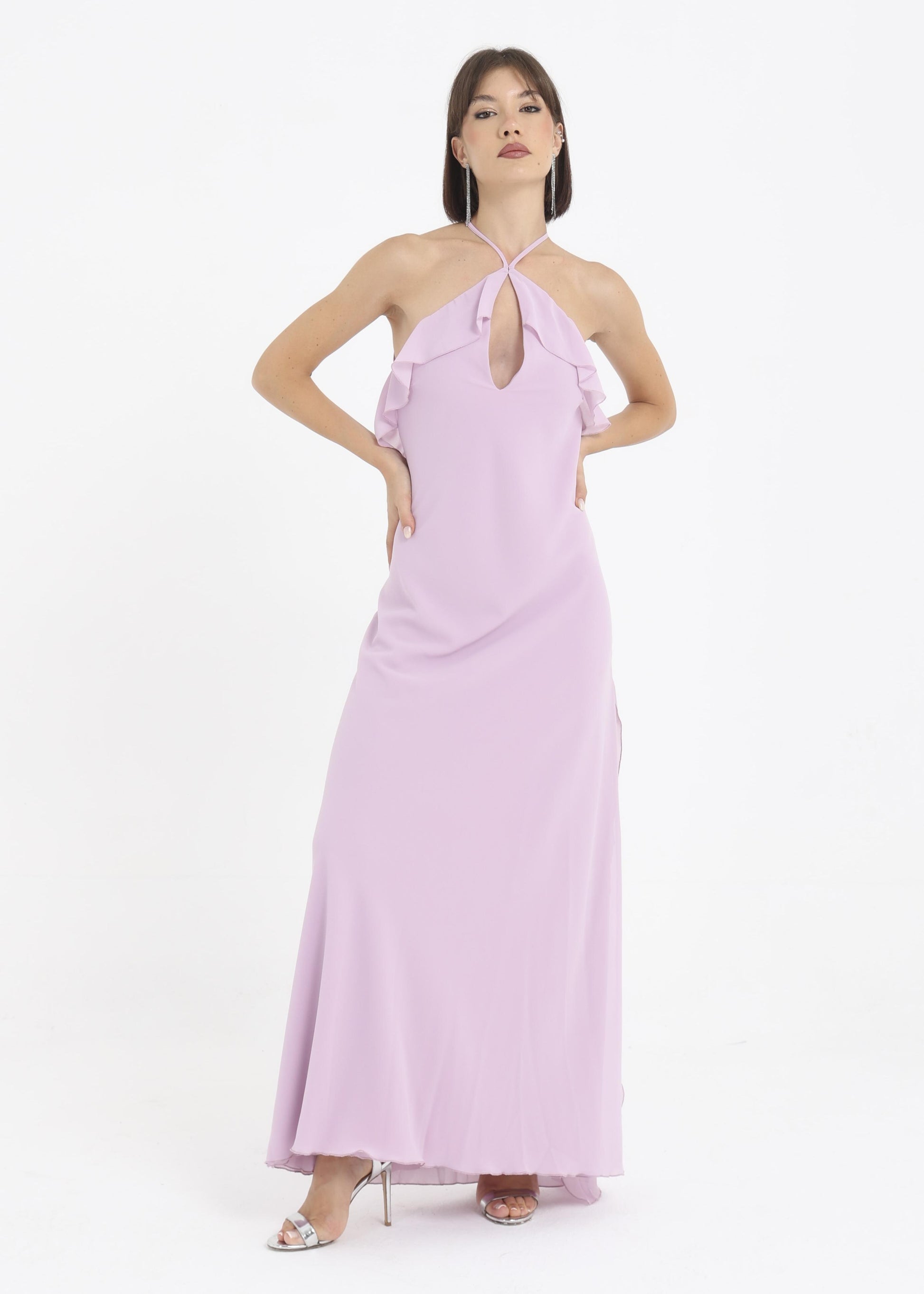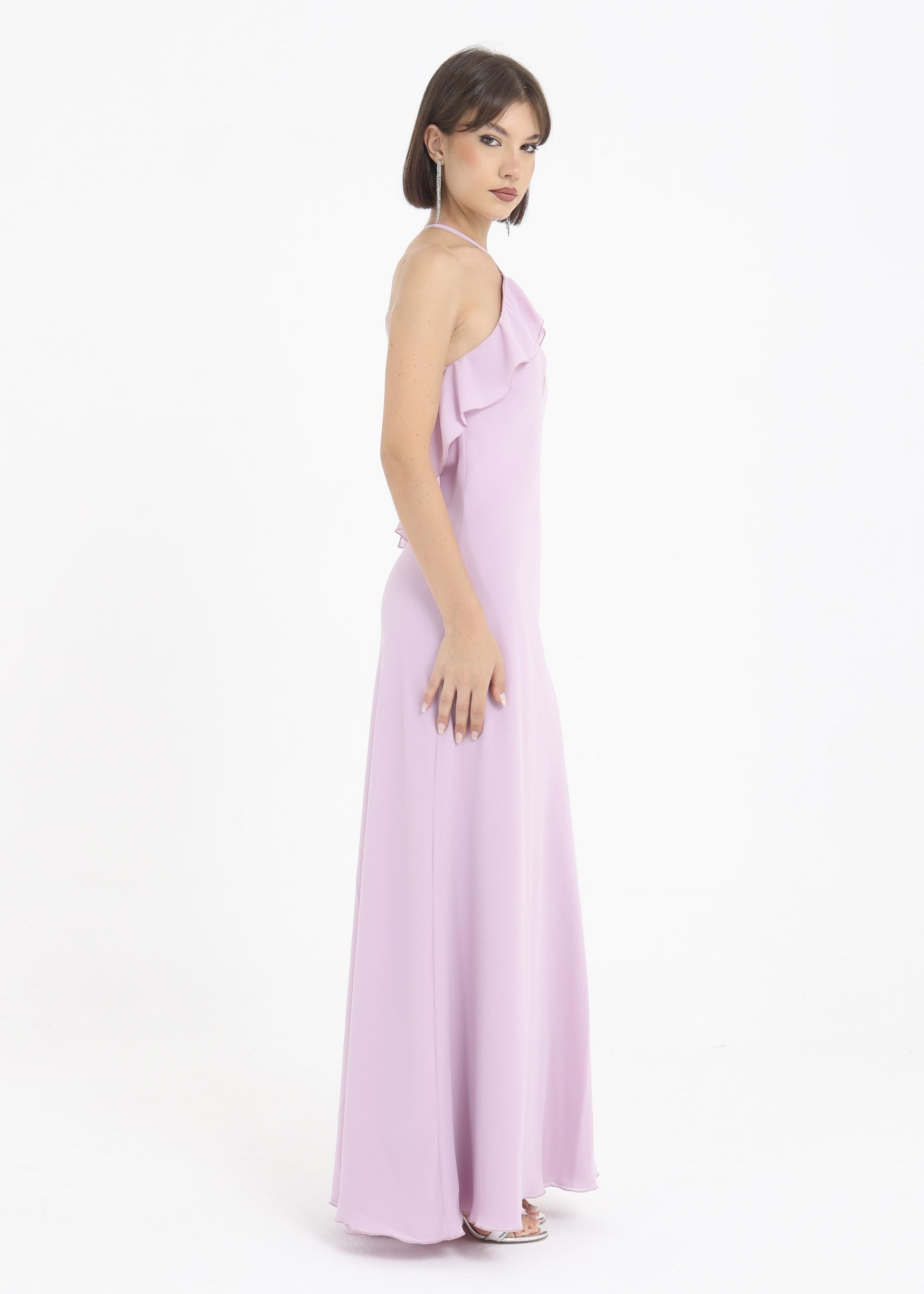 Abito in georgette morbido con rouches sul petto.
