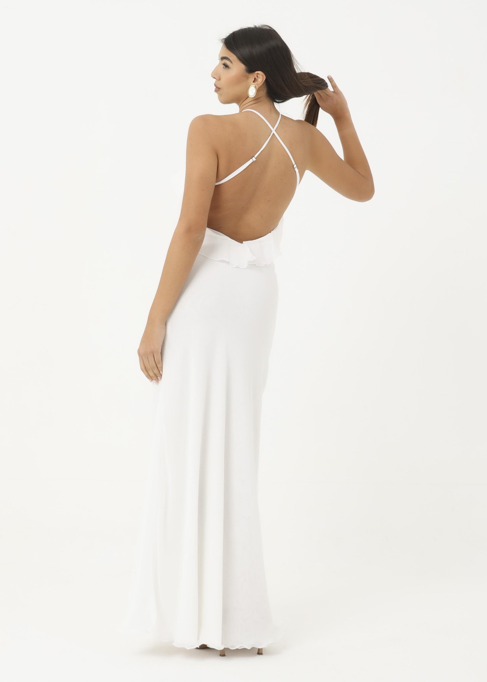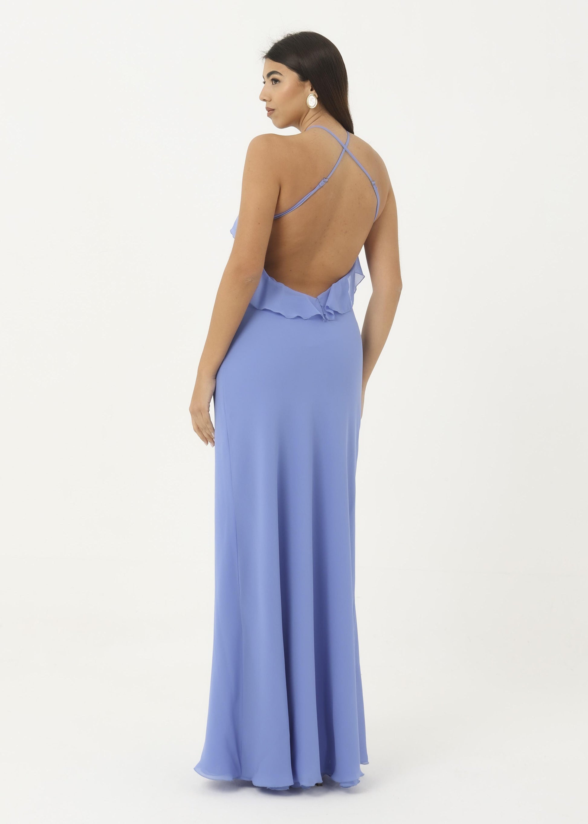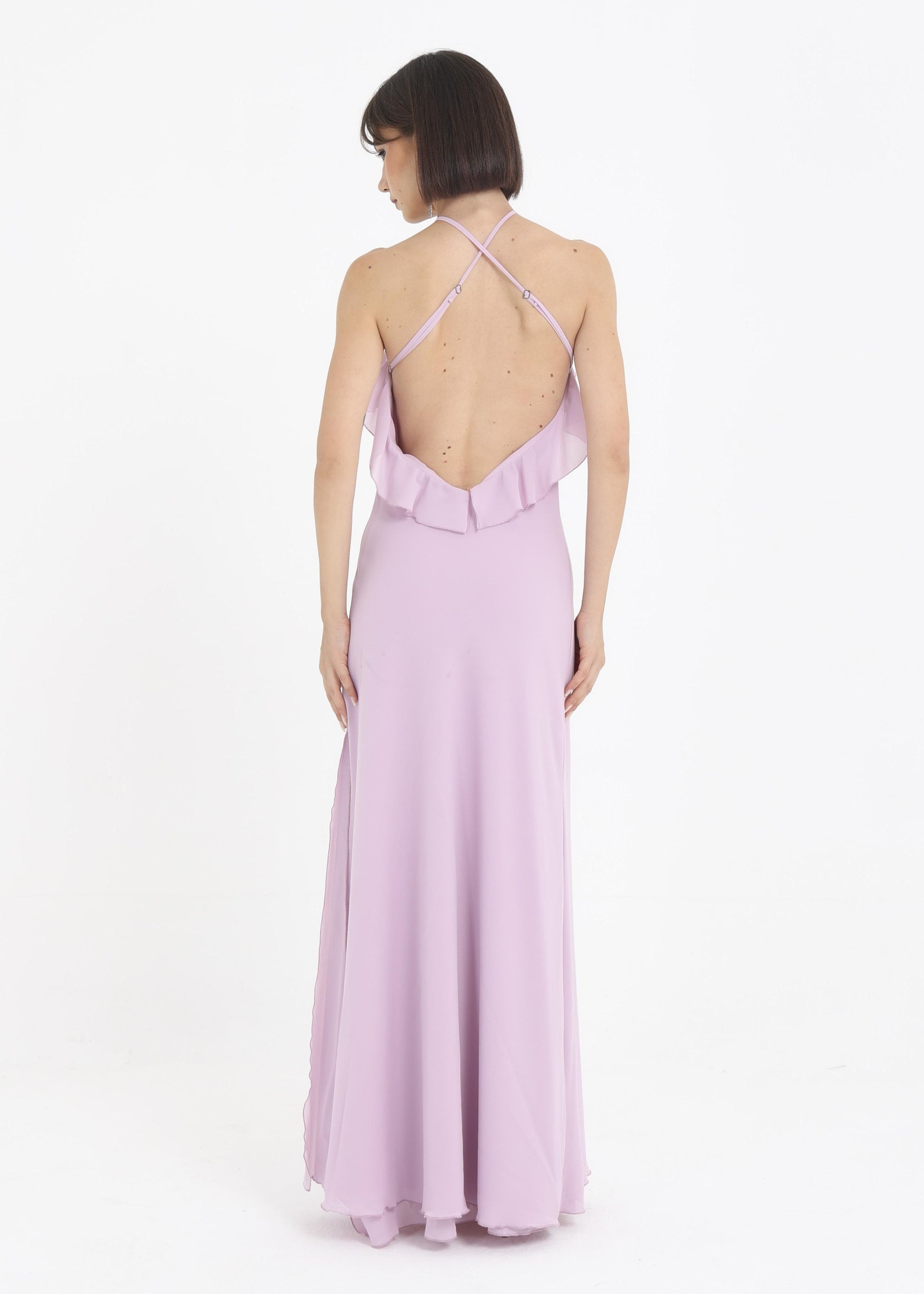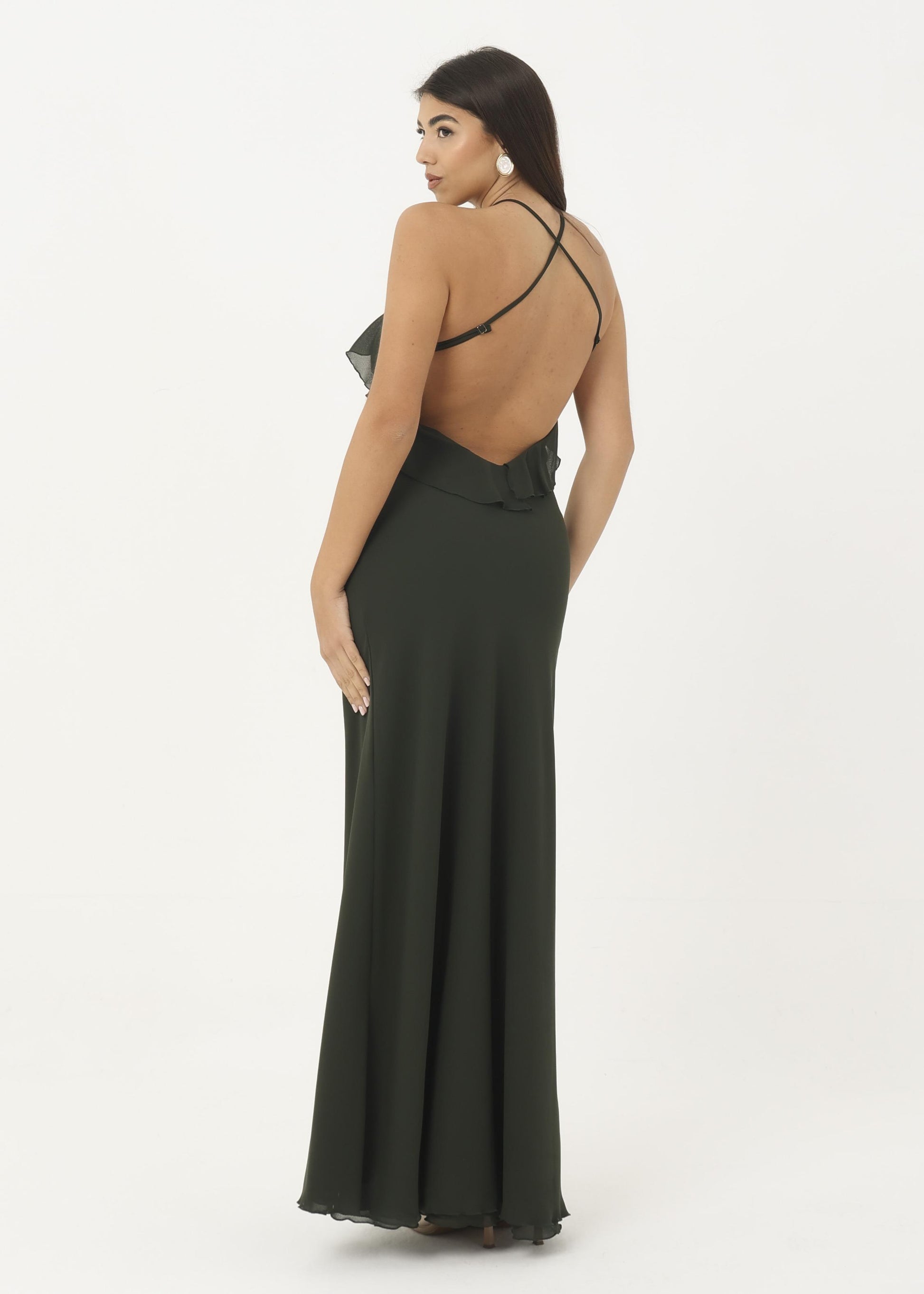 Abito in georgette morbido con rouches sul petto.