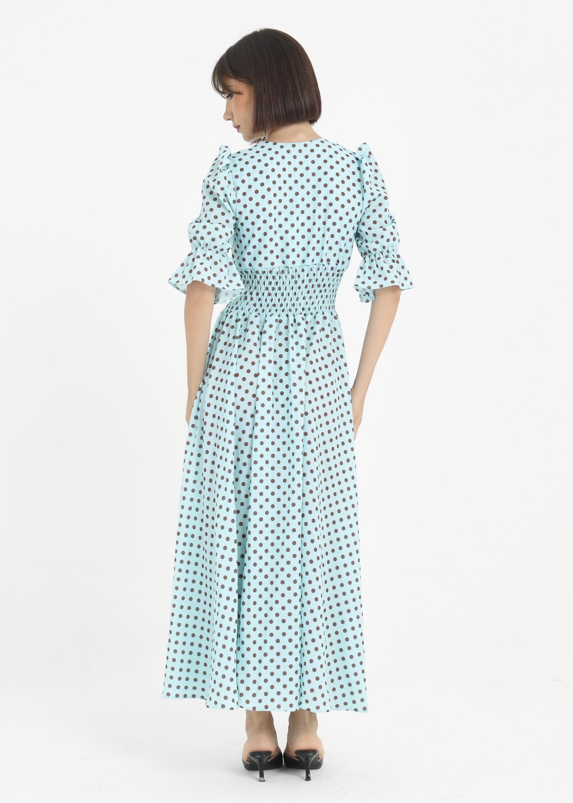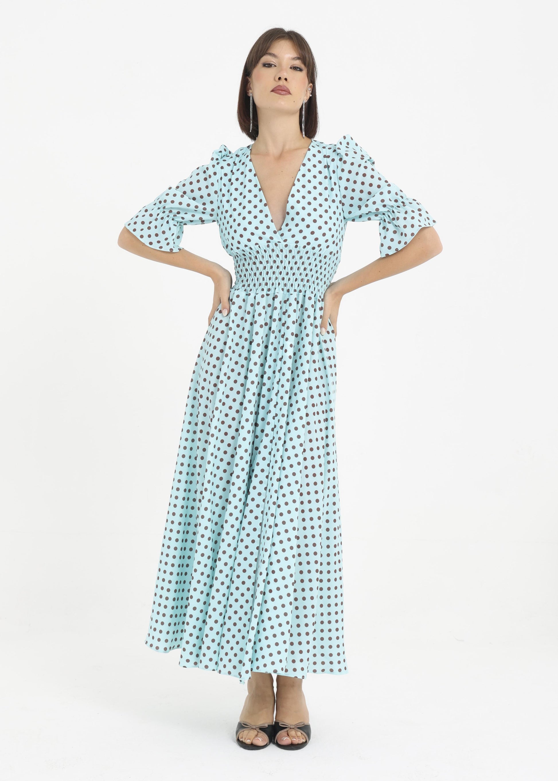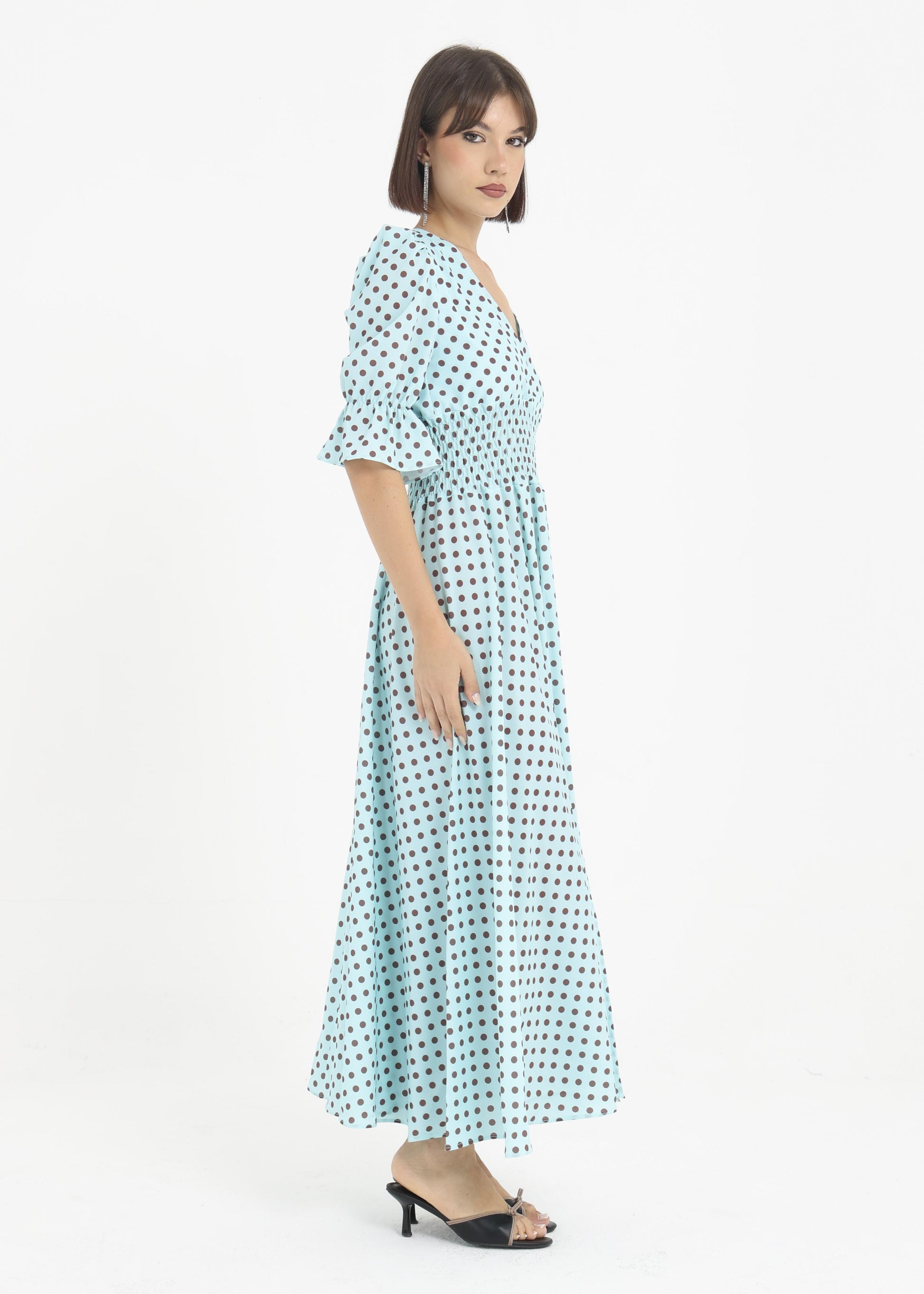 Abito in viscosa con elastico in vita e maniche a sbuffo.